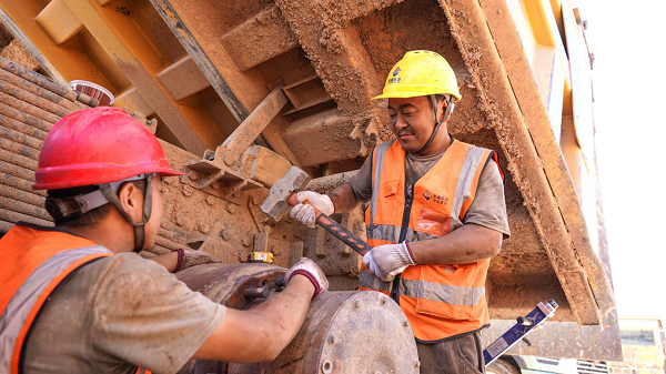 “咱們這都是大型機械維修,天氣這么熱,衣服一會兒濕透,一會兒被烤干,一整天都像是在“桑拿房”?!绷_玉武吃過午飯便與同事陳當鋒緊鑼密鼓地投入到礦卡車橋維修的工作中,烈日當頭,干了不到20分鐘,他全身的衣服就被汗水全部浸透,汗水夾雜著油污流入眼睛,火辣辣的疼,他拿起水壺里的綠豆湯咕咚咕咚就灌下大半壺。