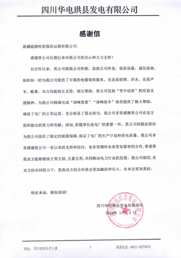 近日,哈密運(yùn)銷(xiāo)公司收到來(lái)自四川華電等多家單位的聯(lián)名感謝信,對(duì)公司煤炭銷(xiāo)售服務(wù)工作表示高度贊揚(yáng)和認(rèn)可。