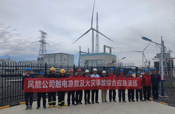 為進一步增強場站職工安全意識,提高應(yīng)對觸電火災(zāi)事故的應(yīng)急處置能力,達坂城風(fēng)電場開展觸電急救及火災(zāi)事故綜合應(yīng)急演練。此次應(yīng)急演練真實模擬了工作人員從事儲能區(qū)作業(yè)時意外觸電和儲能電池倉起火兩個事故場景。
